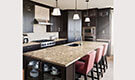 This style blends the features of a traditional kitchen with a contemporary kitchen. Features include a large backsplash behind the stove and an island with a deep sink, storage and seating for three.