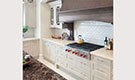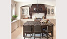 This kitchen highlights traditional glass cabinets, a large breakfast bar/island and a six burner gas stove top.