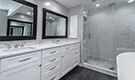 This bathroom features double sinks, a walk-in all glass shower and clawfoot bathtub.