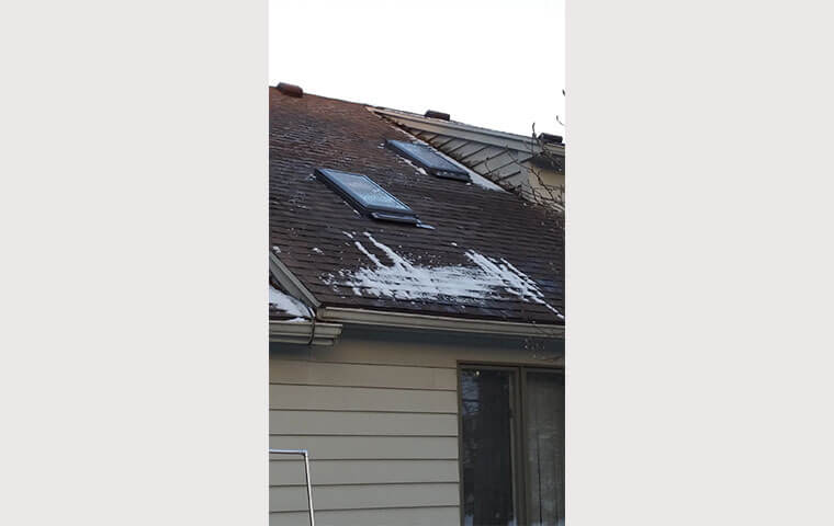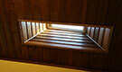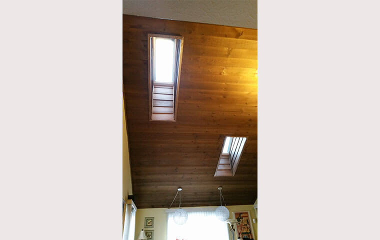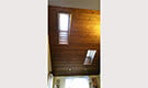 Two offset skylights brighten the living room of this home, while the ceiling and shaft are adorned with wood trim, highlighting the rustic feel of the interior.